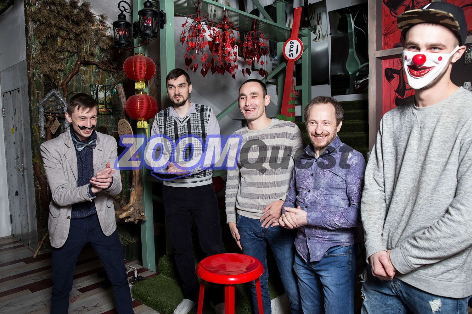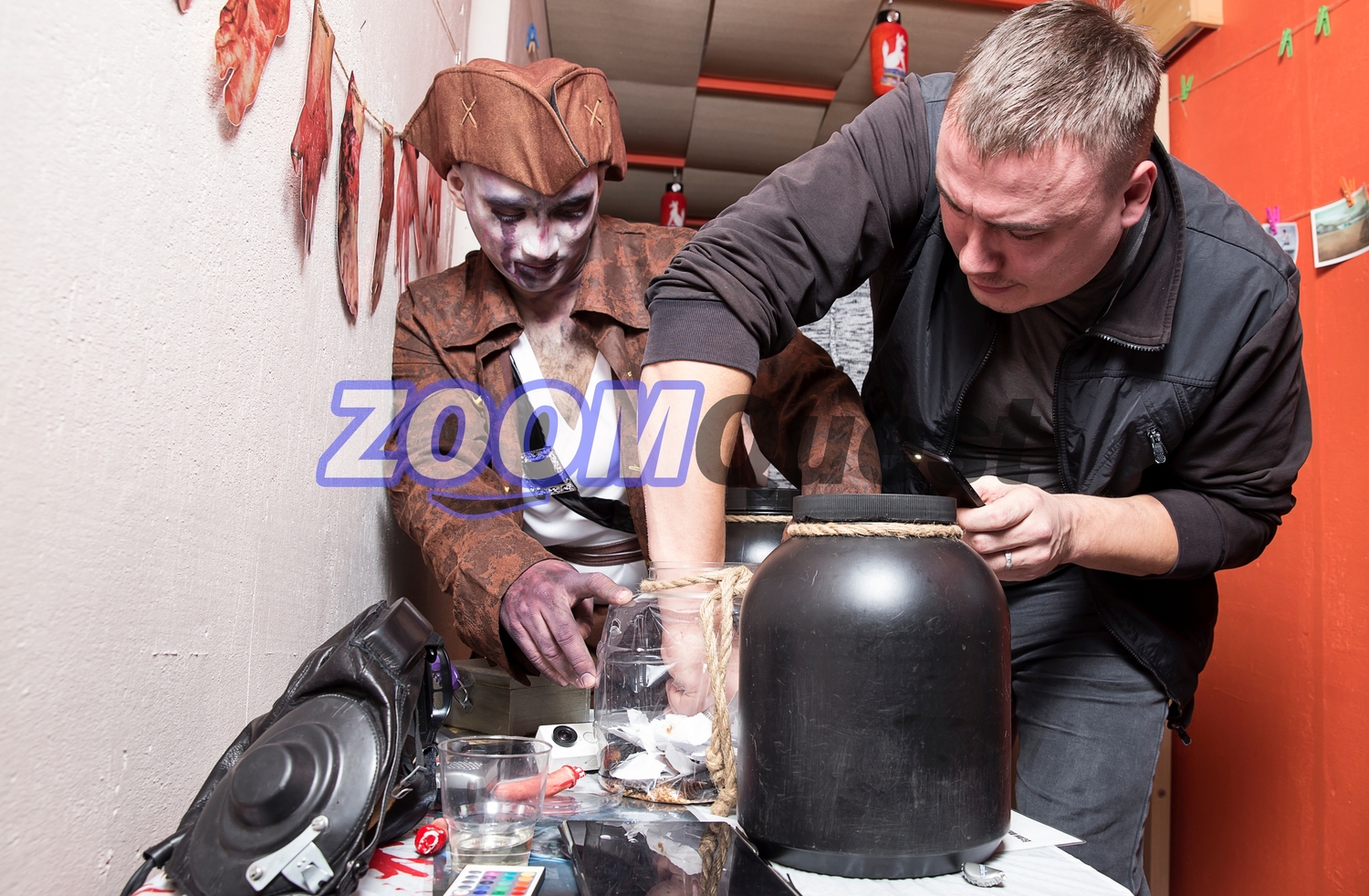 Костюмированные ведущие собирают гостей, рассказывают легенду квеста и делят участников на команды.